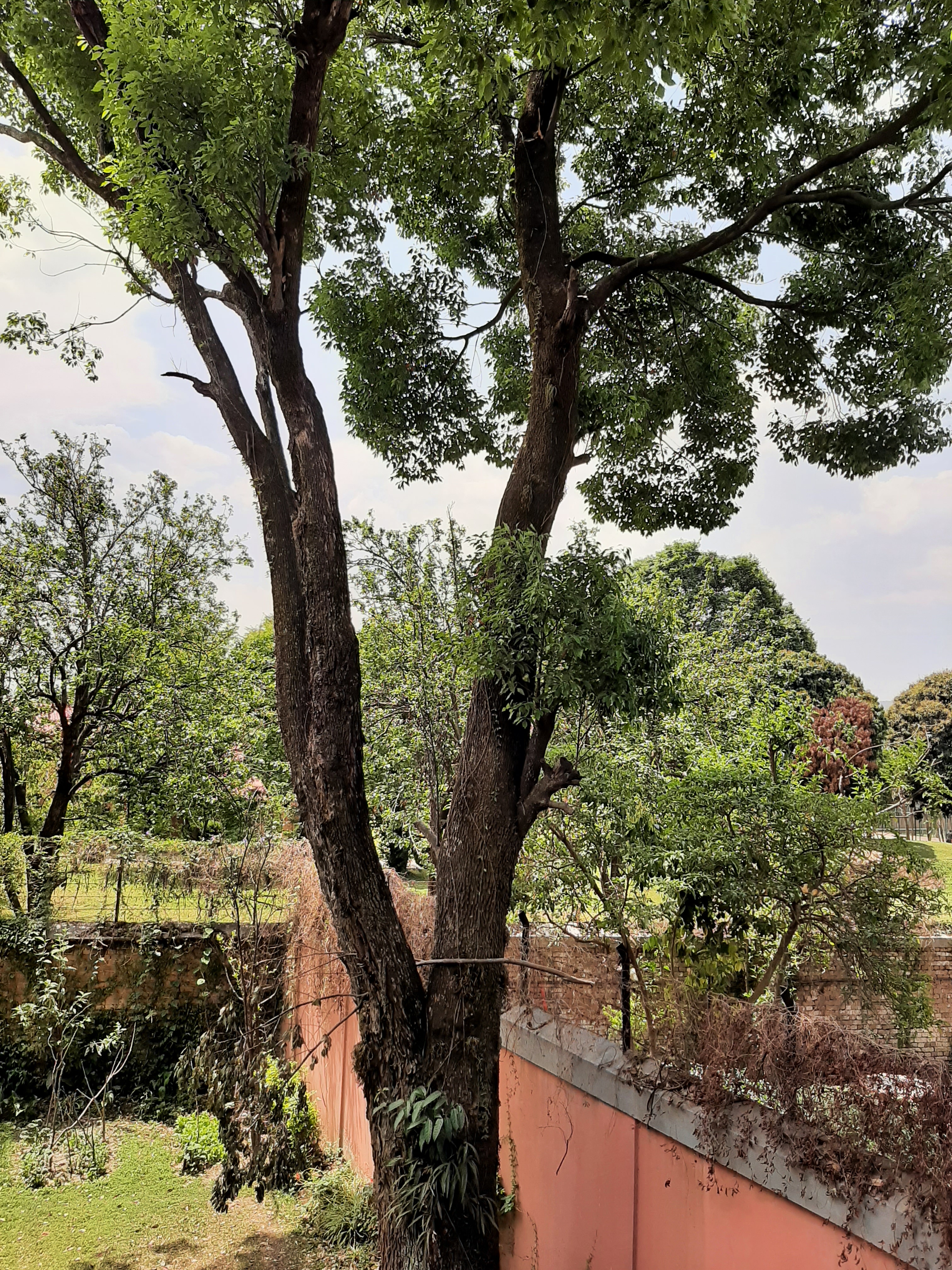 Can you see the large branch stuck between the trunks of the tree? It fell in a storm and is wedged there.